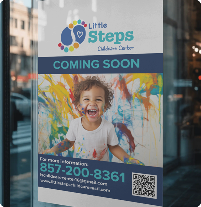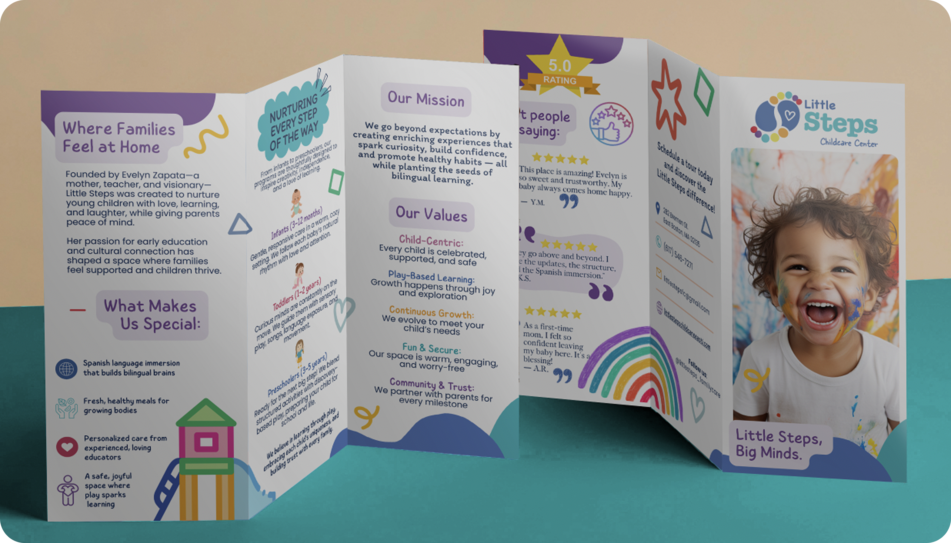 Print materials were crafted to extend the Little Steps brand into the physical environment with clarity and warmth. Brochures, flyers, and parent handouts use friendly typography, soft colors, and bilingual messaging to introduce the center’s philosophy and curriculum. These printed touchpoints help families feel informed, welcomed, and connected from the very first interaction.